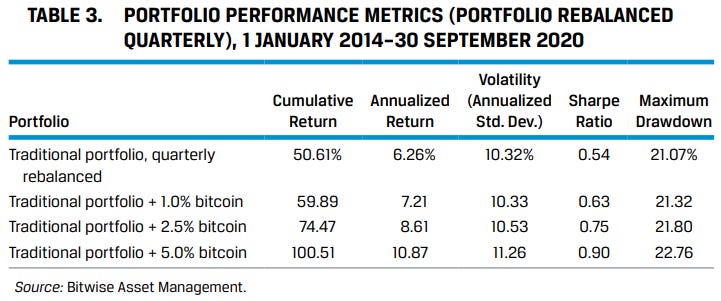 "Historically, adding Bitcoin to a portfolio has had a favorable influence on long-term portfolio performance, both in absolute and risk-adjusted terms." The Sharpe ratio increased from 0.54 to 0.75 as a result."